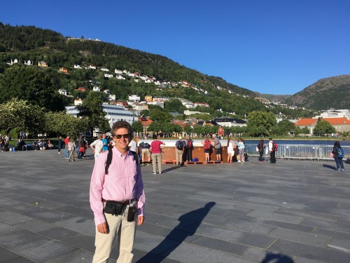 One issue with It not getting dark outside until midnight is that we can’t seem to stop. We feel like we should keep wandering and exploring this pretty seaside town in Norway. It is colder here but sunny and clear which is very good luck considering that this town fancies itself the rainiest place in Europe. We arrived after a short easy flight from Copenhagen and a short bus ride from the super modern and efficient airport. A lovely young woman who got off the bus with us – a Dane getting her masters degree at the university in Bergen – kindly helped us find the nearby but out of the way spot where our Airbnb is located, up a very narrow alleyway lined with old white-painted wooden houses with flower boxes. We are in the attic room of one such house, in an old area just above the red wood houses of the old Bryggen neighborhood. This is a completely charming place.