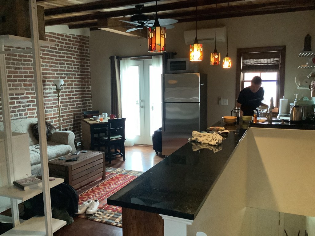 No breakfast so I won’t get my on-the-road Raisin Bran fix. No carpet in our spacious but spartan room, disabled accessible, which was okay until about 1:45 am when people arrived above us in what I’m guessing was also an uncarpeted room. They sounded like a bunch of elephants dragging roller bags and rearranging the furniture for hours. Who needs sleep?