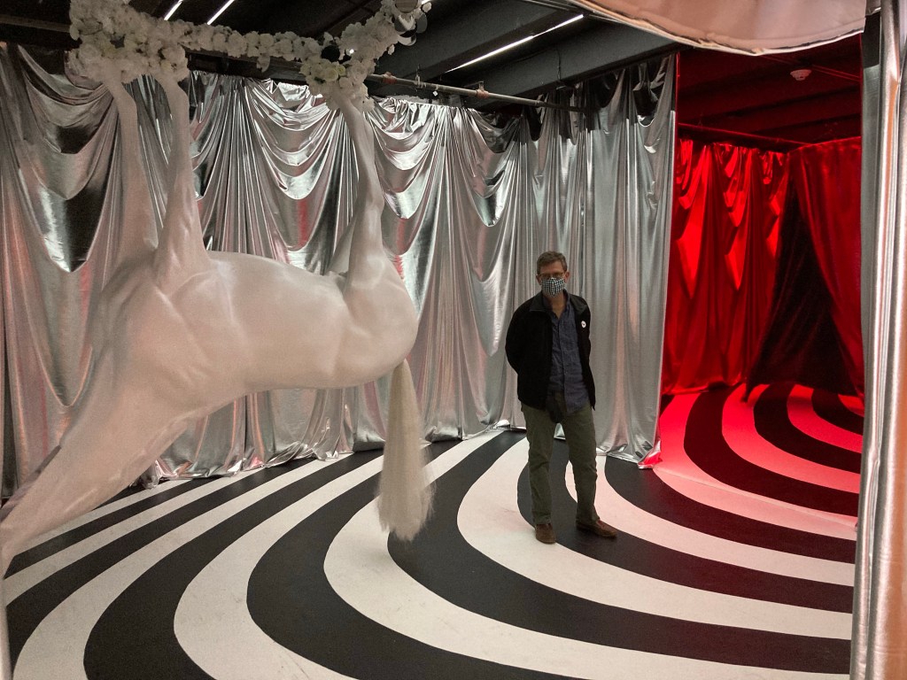 Beyond the four floors of the factory building are two neighborhood houses nearby, also with immersive installations. One installation takes up the entire three floors of the house, with holes cut in the floors so you can look up or down at the adjacent floor. Another had a Small piano hoisted awkwardly in the air on ropes and a song composed for the piece you could play on your phone.