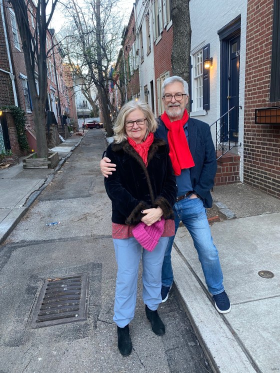 We’re staying in a very old red brick row on a narrow one-block lane in center city, mid-1800s we think. Charming, centrally located Airbnb. With narrow planked wood floors, a tight twisting, low ceiling wood staircase, small pretty rooms, a tiny back yard with a flowering tree of some unknown sort with pink blossoms.