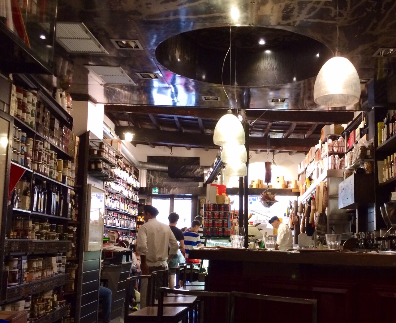 We stopped for an overpriced orange juice and espresso at a cafe overlooking the piazza de populi, which offered a welcome rest and good people watching. Then we meandered back to our hotel (about a half hour walk…we taxied to the gardens), stopping at a well-populated osteria on a small street (l’osteria di memmo Santori on via Dei Soldati,) for one last plate of pasta. We ended up briefly visiting a holocaust museum (free, but we made a donation) in the old Jewish ghetto which had wrenching stories from Italian concentration camp survivors. Dinner tonight was at garbarini, a deli by day that becomes a dinner spot by night, located in the Upscale Prati neighborhood. Fun to be the only non-Italians there.we found a huge speciality food store, Castroni, next door. Goodbye Rome. We’ll be back.