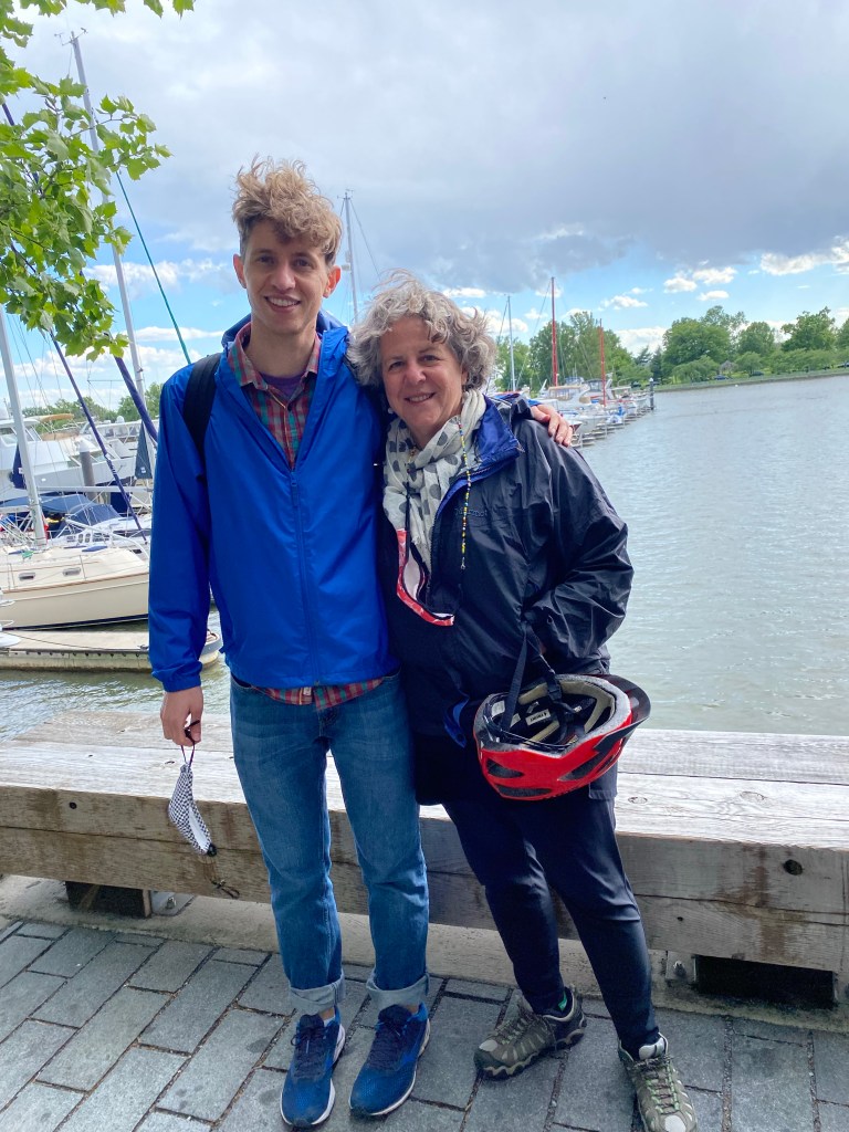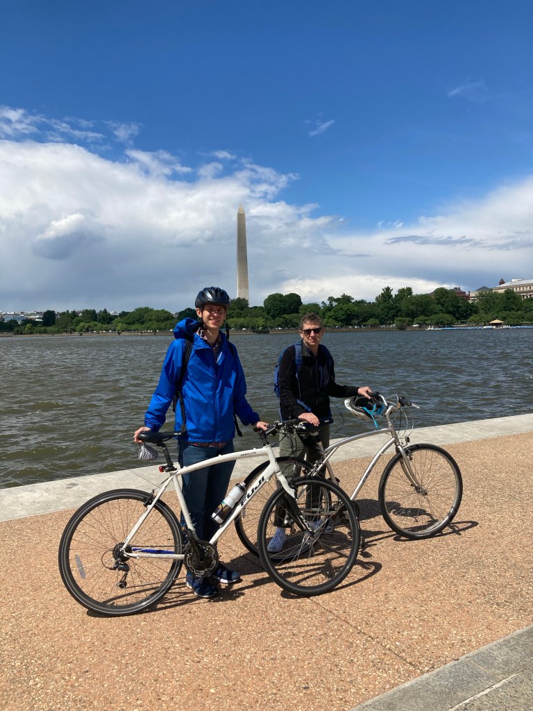 We rode in Noah’s lovely CapitolHill neighborhood, admiring the spring blossoms and old architecture. How strange to have the US Capitol as part of your neighborhood. I couldn’t help but think about the Trump rioters and the Shanksville 9/11 heroes as we passed that august building, now surrounded by a black fence and concrete Jersey barriers. So many threats. Next we glided onto the mall, past the smithsonian museums, the Washington monument and American U. college graduates in their robes posing by the Lincoln Memorial. We rode onto the Jefferson Memorial, covered in scaffolding and looked across the water at the MLK Memorial. We rode around Hains Point or some such which has a golf course and then over to the Wharf development that felt very un- DC, with high rises and trendy restaurants along the riverfront. We had Cuban coffee at Colada Cuban cafe.