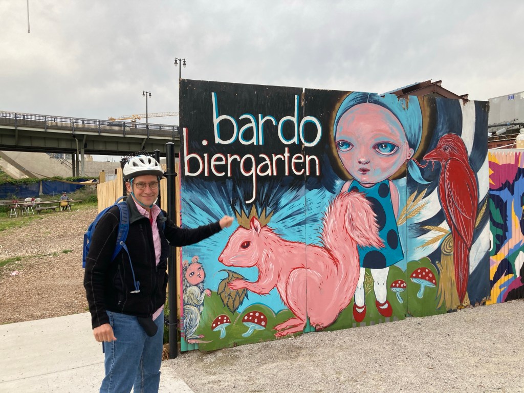 After a good bagel brunch for Mother’s Day with takeout from Call Your Mother, in the Barracks area (near a cocktail bar called Betsy), we set off peddling to Union Market, which seems to have exploded with neighboring high rise developments since I was last there a few years ago. We took the MBT (metropolitan branch trail) through an urban landscape that I would not have pegged as DC had I seen it in photos alone. Next stop Navy Yard and more glass and steel high rises near the Nats ballpark but Noah took us to Bardo biergarten, a surprisingly rustic and bohemian outdoor spot, vaguely reminiscent of a homeless encampment on the riverbank, scattered with worn diner booths and rough wood plank tables in a wooded area. It felt like a lost world, beside the gleaming developments.